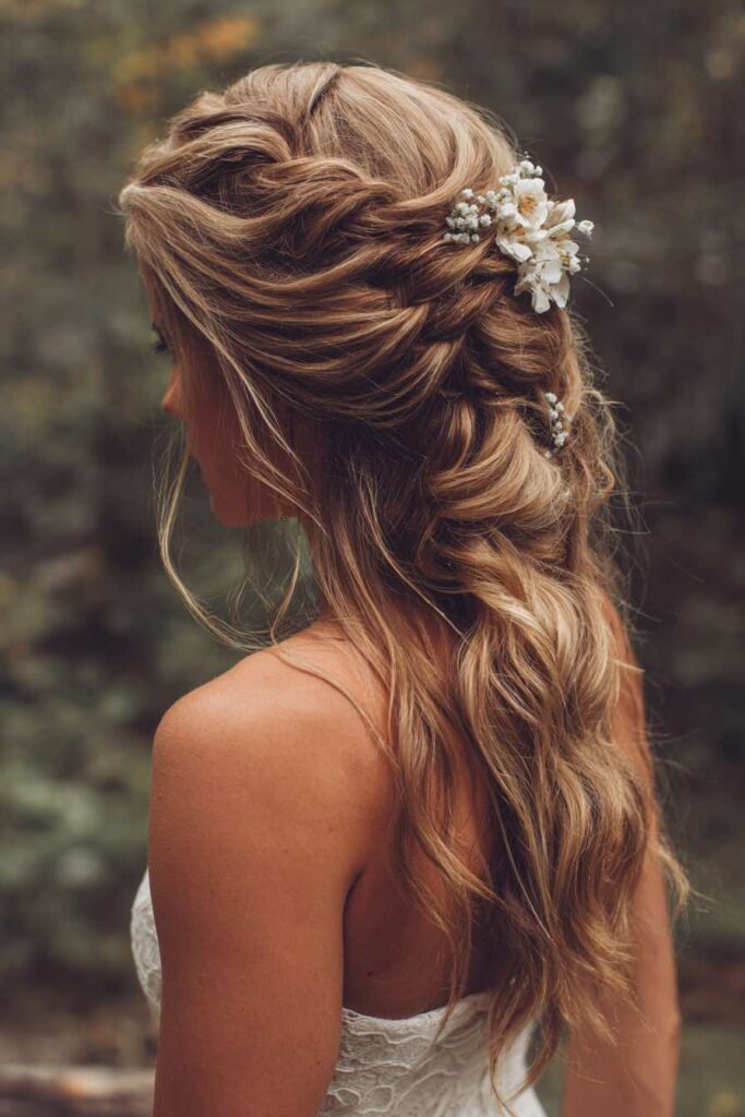 Beachy waves with seashell clips create a carefree, sun-kissed look perfect for outdoor weddings by the water. This hairstyle effortlessly captures the essence of summer and complements the natural surroundings. To achieve these waves, you can use a curling wand or beach wave spray, allowing your hair to flow freely.